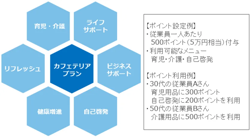 福利厚生制度の一種で「選択型福利厚生制度」と呼ばれています。企業が従業員に一定のポイント(補助枠)を付与し、企業ごとに設計・設定されたメニュー(育児、介護、自己啓発、健康管理等)の枠内で従業員が自分に必要なものを自由に選択、利用できる仕組みです。