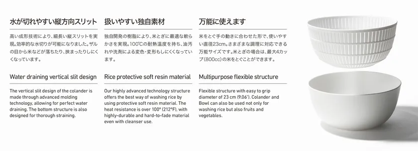 美味しいご飯を炊くには手早く優しく米とぎすることが大切です。ザルは、水切れ・軟らかさにこだわり手早く排水しながら米を傷つけずにとぐことができます。またセットのボウルと組み合わせて使うことで米の浸水もでき、ふっくらしたご飯が炊けます。同製品には、料理研究家 松田美智子先生監修のレシピが封入されています。レシピには米のとぎ方や美味しいご飯の炊き方などが記載されており、ザルとボウルを使った調理方法を読むことができます。ザルとボウルは米とぎだけでなくその他の調理にも対応しています。耐熱性100℃の素材を独自開発し、野菜の湯引きなど米とぎ以外の調理にも使える実用性も兼ね揃えています。またサイズは直径23cmと万能に使えるサイズで実用的なサイズとしています。