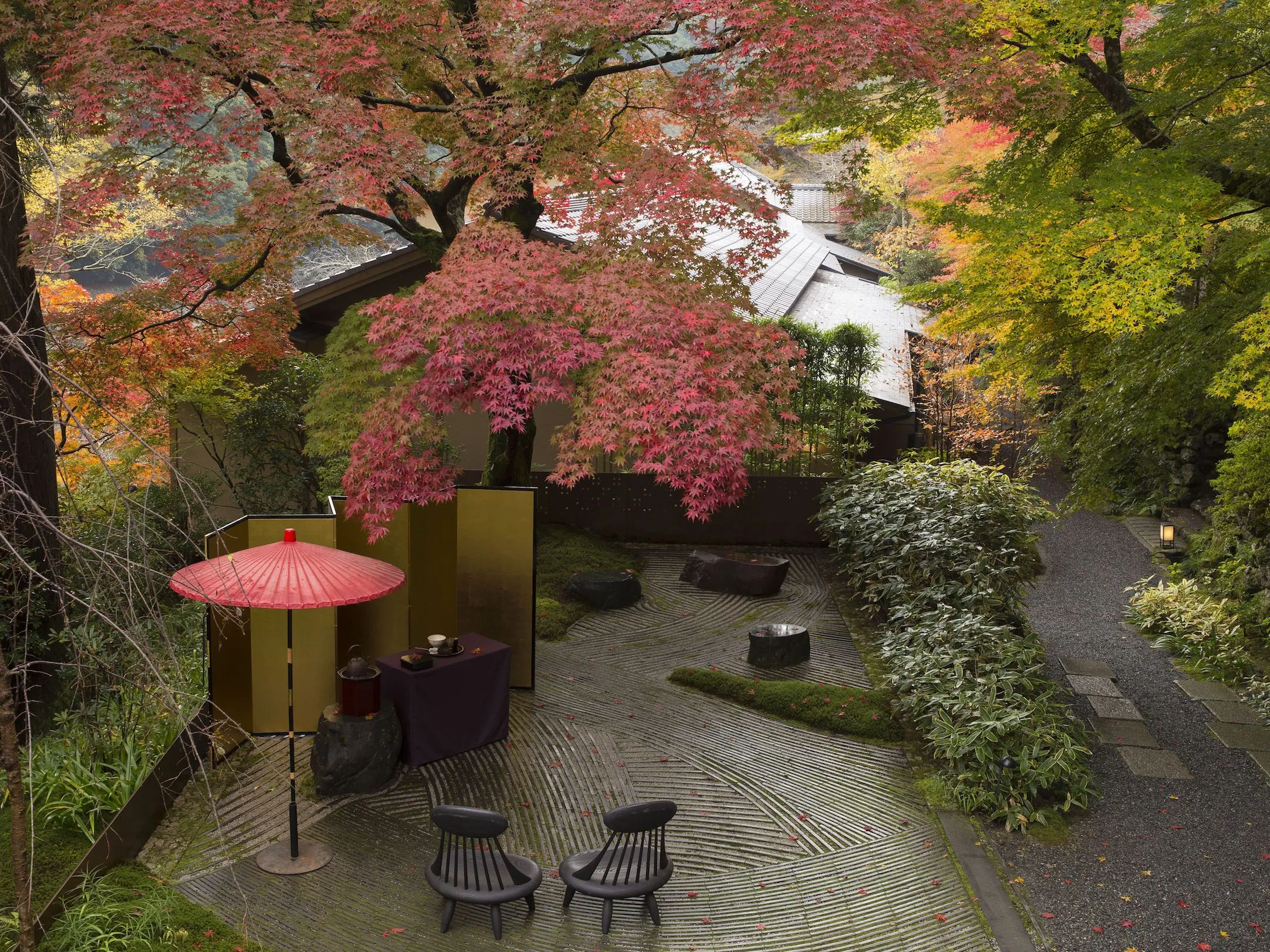 ヘリクルーズの後は、星のや京都の「奥の庭」で行われる宿泊者限定の「もみじ茶会」に参加ができます。この茶会では、庭の樹齢約400年の真っ赤なオオモミジの下に、ソファや座椅子をしつらえます。参加者は、もみじを見上げながら抹茶やスパークリングワインを味うことができます。さらに、茶会では1803年創業の和菓子店「亀屋良長」注3が手がける星のや京都オリジナル和菓子が提供されます。街の喧騒から離れて、ヘリクルーズの余韻をゆっくりと楽しむことができます。
