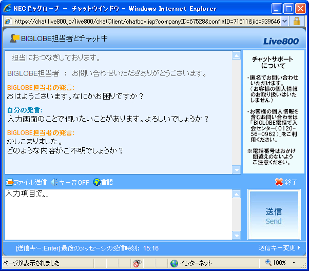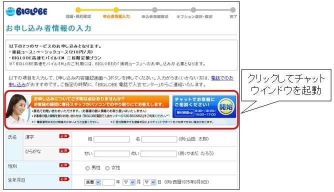 BIGLOBEは、本日より、インターネット接続サービス申し込み時の疑問点や不安を、リアルタイムに解決するサービス『チャットサポート』のトライアルを開始します。