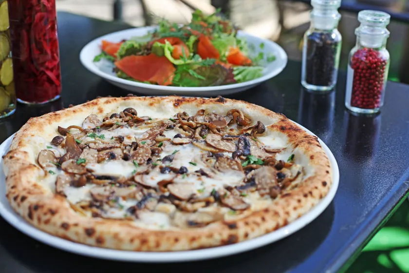 (手前)松茸のピッツァ、(奥)サーモンのミックスサラダ