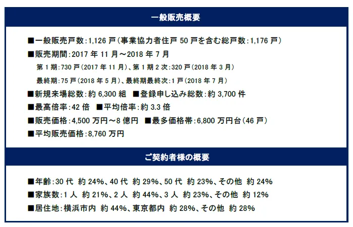 本物件は、2016年12月より資料請求受付を開始し、2017年8月のモデルルームの公開(事前案内会を含む)以降、新規来場総数は約6,300組、登録申し込み総数約3,700件と多くのお客様に購入のご検討をいただきました。なお、お申し込みの平均倍率は約3.3倍、最高倍率は42倍となりました。