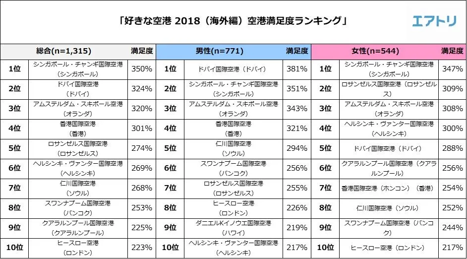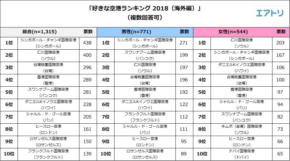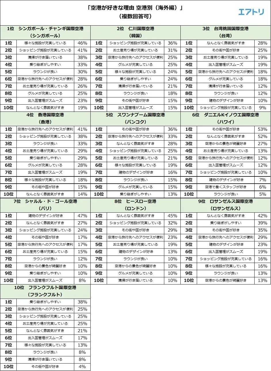 男女別では、「シンガポール・チャンギ国際空港(シンガポール)」(男性の35%が選択)と「仁川国際空港(ソウル)」(女性の37%が選択)が、それぞれ好きな空港の1位となりました。