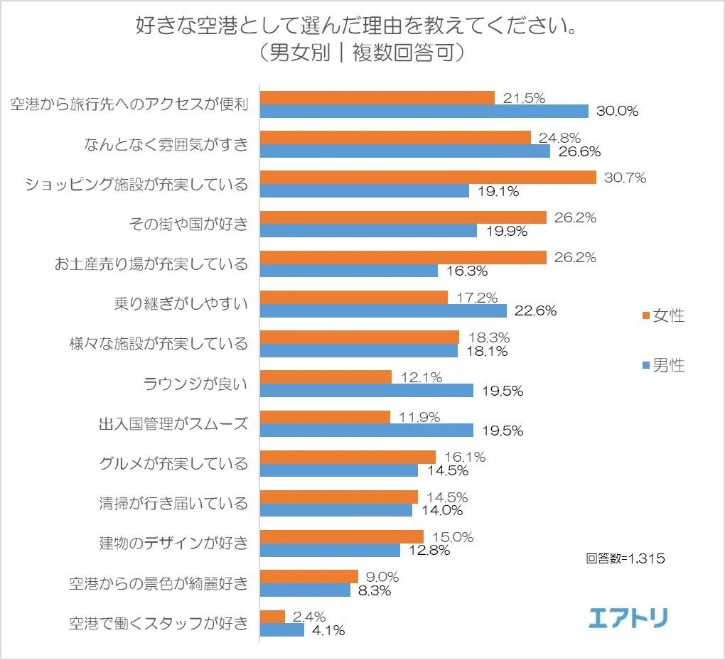 好きな空港として選んだ理由は、「空港から旅行先へのアクセスが便利」と回答した人が一番多く、これは全体の約27%ともっとも高い割合でした。男女別の割合でみると、男性で30%、女性で21.5%であり、女性よりも男性の方がより「利便性」を重視していることがわかりました。一方で、「ショッピング施設が充実している」(男性19.1%、女性30.7%)、「お土産売り場が充実している」(男性16.3%、女性26.2%)と、回答した女性の割合が男性よりも高いことから、女性は「グルメやショッピングなど施設の充実度」を重視していることがわかり、いずれも、「国内の好きな空港」(※1)を選ぶ理由と同じ傾向となりました。
