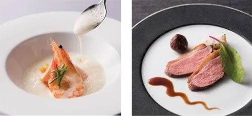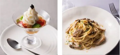 当店の顔である“劇場型ライブキッチン”からお届けするメインディッシュでは、客層や食事の用途に合わせて、昼と夜で違うメニューをご用意。ランチでは「ポルチーニと茸のパスタ」ディナーではトリュフやいちじくが香る「鴨胸肉のポアレ」、オマール海老やキャビアと楽しむオードブルが新登場。平日ランチ&ディナー、日祝ディナーは時間無制限で楽しめることもポイントです。