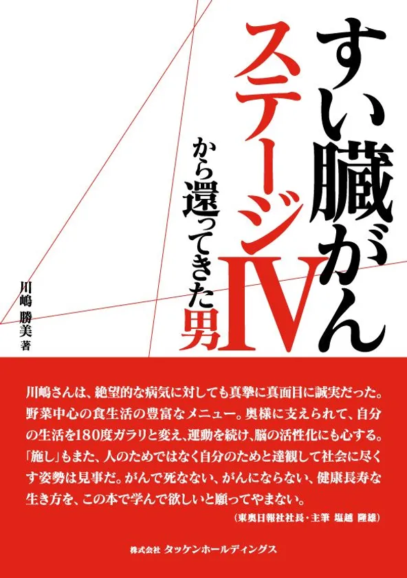 協同組合タッケンの出版部門である株式会社タッケンホールディングスは、著者・川嶋 勝美が余命7ヶ月のすい臓がんステージIVを告げられてから、すい臓尾部切除、胃の3/4や十二指腸、脾臓、胆嚢、横行結腸の一部切除を乗り越え寛解となるまでの軌跡を綴った書籍「すい臓がん ステージIVから還ってきた男」の電子書籍を出版いたしました。