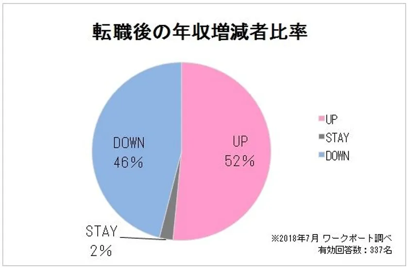 調査の結果、転職によって年収がUPした人は全体の52%で、6月と同じ割合となりました。年収UP率が高かった4月(59%)・5月(58%)に比べると、7月は6~7ポイント下がってはいますが、依然として半数以上が転職によって年収UPしています。