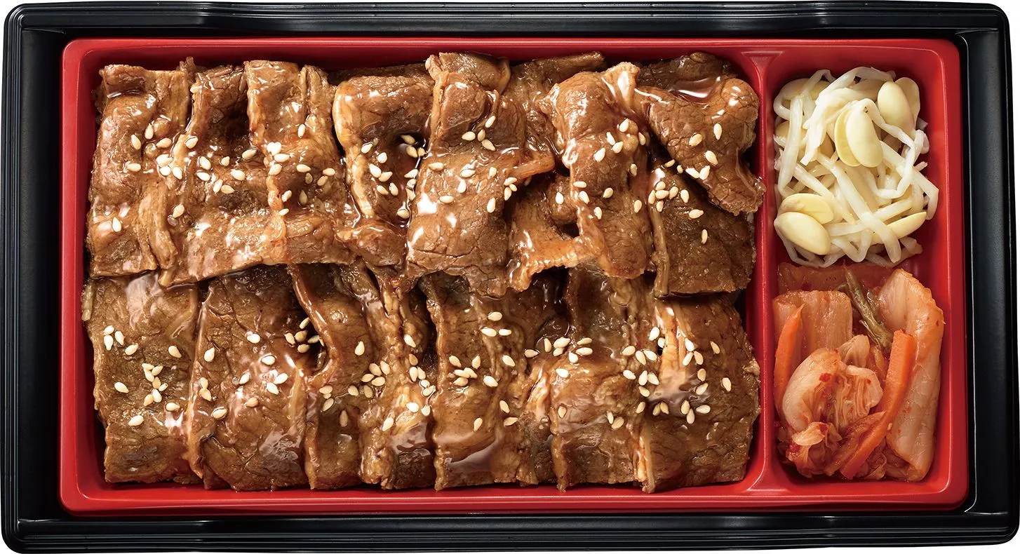 牛角店舗で販売しているビビンバを参考に商品化したチルド弁当です。豆もやしナムル、キムチ、小松菜ナムル、ぜんまいに牛角店舗で使用しているタレで味付けした牛ミンチをトッピングしました。さらに味のアクセントとして半熟玉子をトッピング。別添のコチュジャンで味の変化も楽しめます。