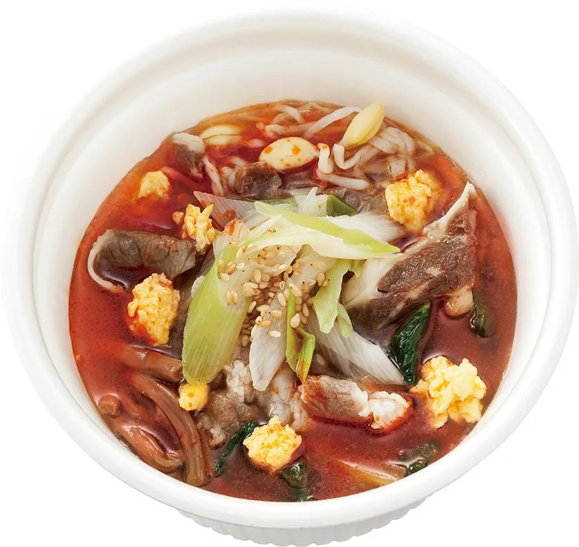 ピリ辛のユッケジャンスープに炒り玉子を浮かべ、小松菜や豆もやし、ぜんまいのナムルをトッピングしました。温めると赤くなり、辛みが際立つスープが特徴です。