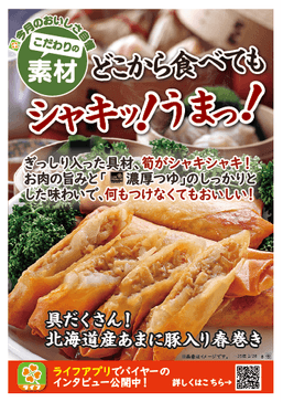 「具だくさん!北海道産あまに豚入り春巻き」は、首都圏ライフ138店舗の惣菜売り場にて販売しております。