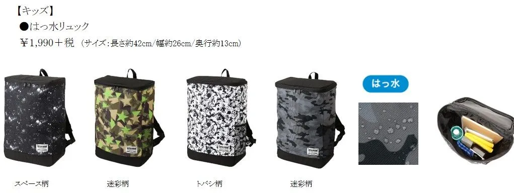 はっ水機能付きのリュックは、これからの秋の長雨や台風シーズンに安心のお役立ちアイテムです。A4サイズのノートや教科書から、お弁当まですっぽり入るので、シーンに合わせて幅広く使えます。