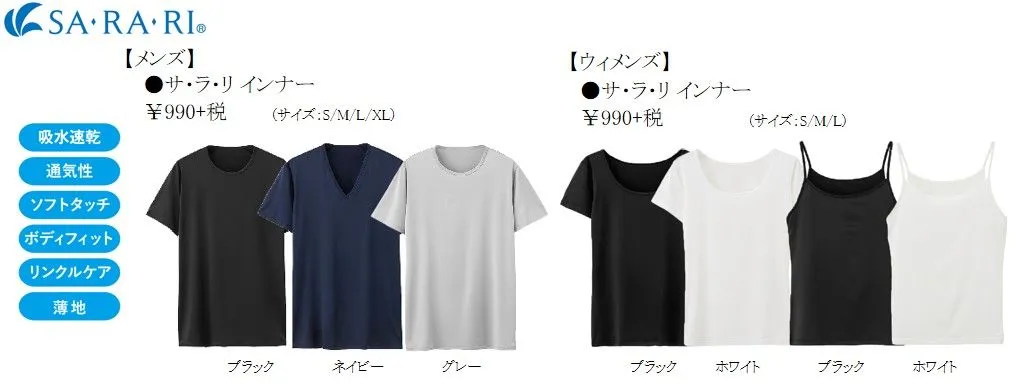 また、まだまだ続く暑い夏に最適な速乾インナー「サ・ラ・リ」もおすすめ。着心地も良く、これからも長く着られるオールシーズンのインナーです。