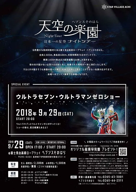 総合光学機器メーカー株式会社ビクセン(本社:埼玉県所沢市、代表取締役:新妻和重)は、長野県阿智村にある富士見台高原ロープウェイ ヘブンスそのはらで、2018年9月29日(土)に開催される天空の楽園日本一のナイトツアースペシャルイベント ウルトラセブン・ウルトラゼロショー』に協力します。