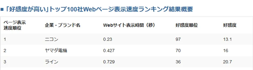 ■好感度が高いトップ100社対象『ページ表示速度ランキング』結果概要
