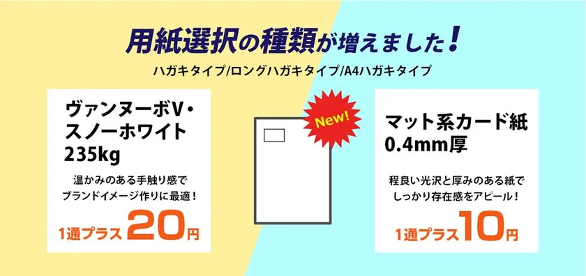 ハガキタイプ、ロングハガキタイプ、A4ハガキタイプの3タイプにおいて、紙本来の温かみがあり優しい手触り感である「ヴァンヌーボV・スノーホワイト235kg」を1通あたりプラス20円にて、カード紙ならではの厚みのある「マット系カード紙 0.4mm厚」を1通あたりプラス10円にて、お選びいただけます。