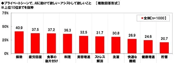 全回答者(1,000名)に、プライベートシーンにおいて、どのようなことをAIに助けて欲しい・アシストして欲しいと思うかを聞いたところ、TOP5は「掃除」(40.9%)、「疲労回復」(37.5%)、「食事の後片付け」(37.2%)、「料理」(36.3%)、「美容増進」(32.5%)となりました。日常の家事のほか、たまった疲労の回復や美容ケアをAIに手伝って欲しいという人が多いようです。そのほか、「ストレス解消」(31.7%)や「快適な睡眠」(26.9%)、「健康増進」(24.6%)といった健康関連のサポート、「貯蓄」(20.7%)などがTOP10にランクインしました。