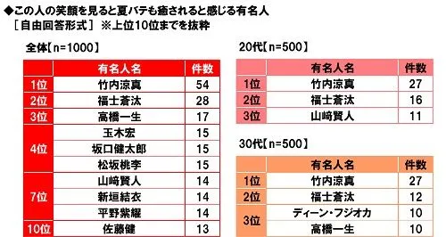 まず、全回答者(1,000名)に、「この人の笑顔を見ると夏バテも癒される」と感じる有名人を聞いたところ、1位は「竹内涼真さん」、2位は「福士蒼汰さん」、3位は「高橋一生さん」となりました。ドラマや映画で見せる、彼らのさわやかな笑顔に癒されているビジネスウーマンが多いのではないでしょうか。