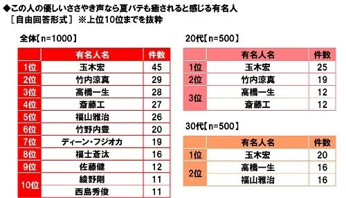 また、「この人の優しいささやき声なら夏バテも癒される」と感じる有名人を聞いたところ、1位は渋い低音ボイスが印象的な「玉木宏さん」、2位は「竹内涼真さん」、3位は「高橋一生さん」となりました。