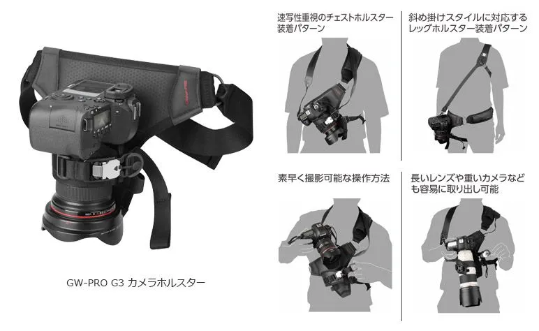 「GW-PRO G3 カメラホルスター」を使用することでカメラを体にフィットさせ、揺れを抑えて安定して携行できます。