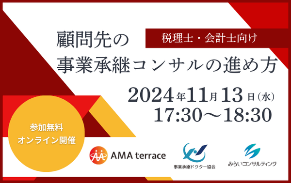 みらいコンサルティンググループ(本社:東京都中央区、代表:久保 光雄 岡⽥ 烈司)は、2024年11月13日にセミナー『顧問先の事業承継コンサルの進め方』をWEBにて開催します。