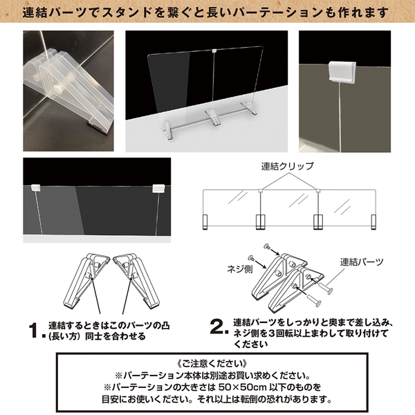 ホームセンターなどで販売されているアクリル板は、厚さ1.5mm~3.0mmが主流です。その厚みにフレキシブルに対応、簡単にオリジナルのパーテーションを設置することが可能です。大きさの目安:50cm×40cm程度のアクリル板