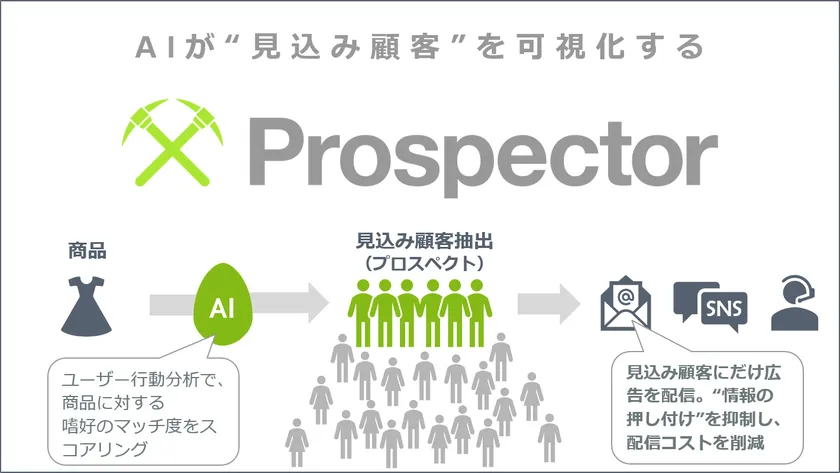 『プロスペクター』は、購買履歴などの行動データを取り込み、独自のAIが特定商品に対して好感を持ちそうなユーザーを分析します。商品とのマッチ度の高い見込み顧客(プロスペクト)のランキングを生成し、従来の「年齢」「性別」といったセグメント分析とは異なる、ユーザー個人の嗜好に基づくターゲティングを実現します。