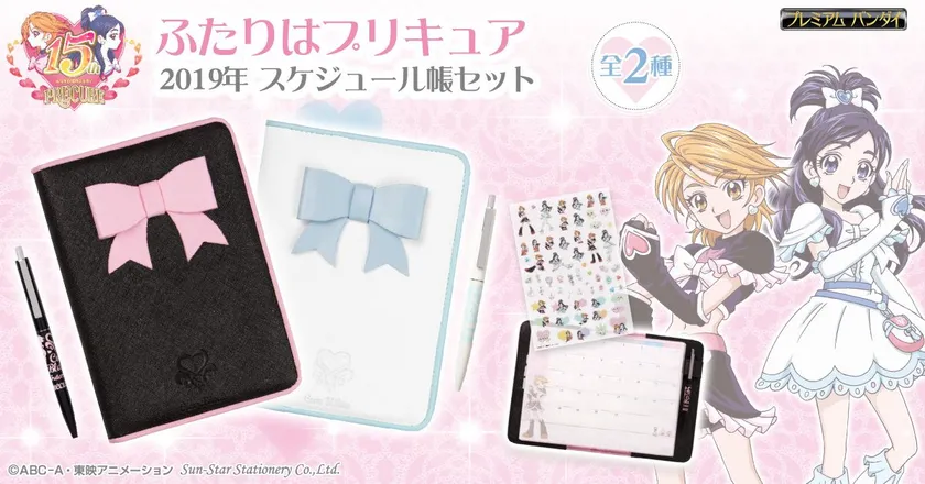 バンダイ公式ショッピングサイト「プレミアムバンダイ」( http://p-bn.jp/su/1210t36f8va2/ )内のショップ「サンスターステーショナリーストア」では、アニメ“プリキュアシリーズ”の初代「ふたりはプリキュア」が2018年でアニメ放送開始から15周年を迎えたことを記念し、カバー付き手帳とボールペン・スケジュールシールがセットになった『ふたりはプリキュア 2019年 スケジュール帳セット』(全2種、各5,940円 税込/送料・手数料別途)の予約受付を、2018年8月24日(金)13時に開始いたします。(発売元:サンスター文具株式会社)