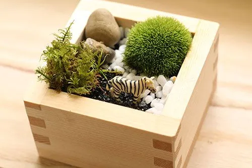 枡の中に作る自分だけのミニガーデン。苔や石、フィギュアを自由にレイアウトしよう。