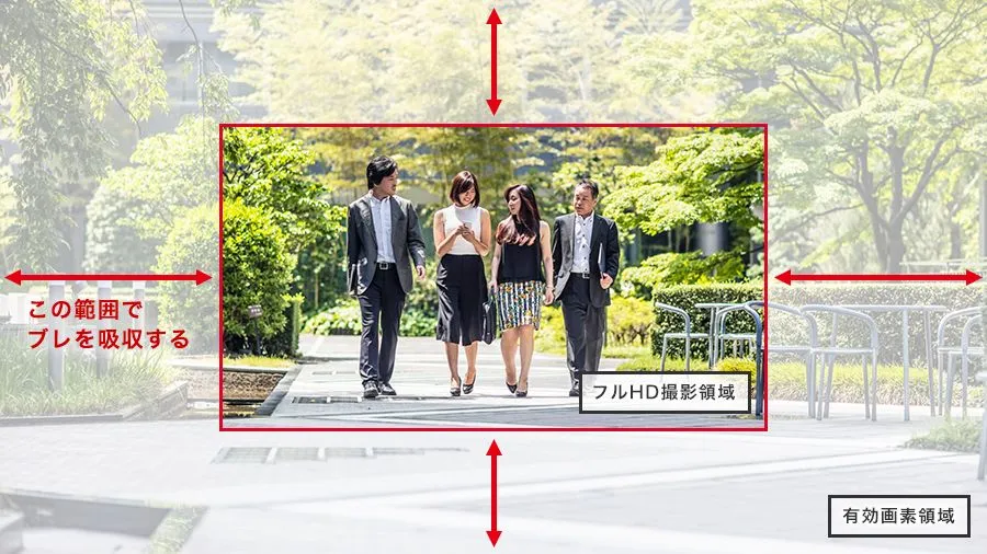 電子式の強力なブレ補正機能を搭載。約1,110万の有効画素の余裕部分を補正領域として活用することで、上下左右と回転方向における映像のブレを吸収、歩行時や走行時の振動の影響が少なく見やすい映像の撮影が可能です。民生用カメラ商品の手ブレ補正技術をベースに、業務用途での動作に合わせて、補正する揺れの振動周波数や補正領域の範囲などを最適化しています。