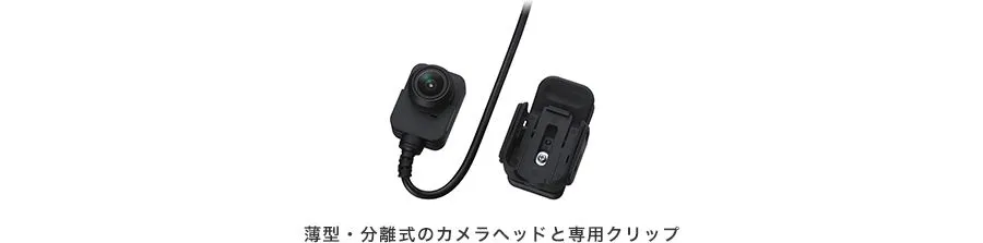 カメラヘッド部は薄型デザインの小型・分離式を採用しており、頭部や胸部への装着が可能です。視線と連動した手元の撮影が要求される場合は頭部、広角・広域での画像が必要とされる場合は肩部に比べて安定した映像を得ることが可能な胸部に装着するなど、用途に応じて装着位置を選択できます。胸部装着の場合には付属の専用クリップを使用することで簡単に付け外しが行えます。