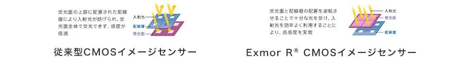 また、『TECU-001』は受光面と配線層の配置を逆転させることで従来型のCMOSセンサーに比べ高感度を実現した裏面照射型のExmor R(エクスモアアール)CMOSイメージセンサーを採用しました。最低被写体照度2.0ルクスという高感度で、夜間や暗所でも鮮明な映像が撮影できます。