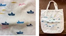 船のカタチのスタンプを押して、エコバックに自分だけの海の風景を作ります。できあがったエコバックは持ち帰ることができます。