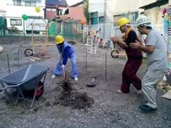 アーティストユニット「大木土木とミツヤ電機」と土木作業の現場を簡易的な朝礼・穴掘りや整地作業などを通して楽しく体験できます。途中参加も可能です。