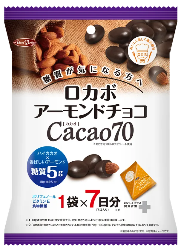 『ロカボアーモンドチョコ カカオ70』は1袋の糖質を5g ※1(1日の間食における推奨糖質量以下)に抑え、1週間分パック(7袋入り)※2 にした“満足のおいしさ&食べごたえがある”ロカボな食生活に適したアーモンドチョコです。