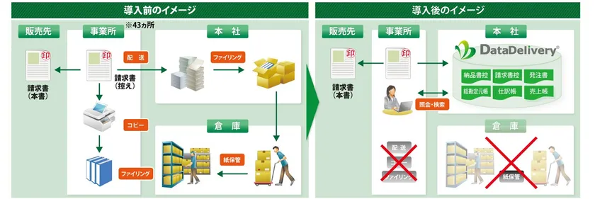 DataDelivery(R)の導入により、各43事業所で実施していた請求書などの控え印刷・配送・保管作業がなくなり、年間500時間以上の時間短縮およびコスト削減を見込まれています。2017年9月に請求書・納品書などの控え、2017年12月には総勘定元帳・仕訳帳・売上帳などの帳簿の申請と、段階的に電子化の範囲を拡大されました。また、今後は経費の領収書などのスキャナ保存についても検討される予定です。