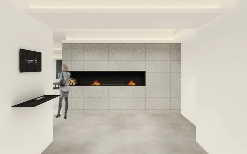 ショールームの設計を担当するのは、「エコスマートファイヤーコントラクトショールーム」のデザインが評価され『DSA日本空間デザイン賞2017 銀賞』を受賞したトネリコ社。白を基調としたモノトーンのショールームで、炎を引き立たせた空間づくりをしています。また、アウトドアリビングを想起させる空間をつくることで、住宅の内と外が連続して繋がるイメージを持っていただけるショールームとなっております。本ショールームを通じて「エコスマートファイヤー」をリアルに体験いただき「インテリア」としての楽しみ方をご提案いたします。