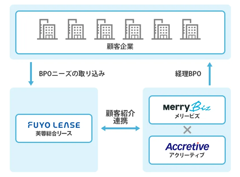 「ビジネスを楽しく!」をビジョンに、経理サービスを提供するメリービズ株式会社(本社:東京都中央区、代表取締役:工藤 博樹、以下「メリービズ」)は、芙蓉総合リース株式会社(本社:東京都千代田区、代表取締役社長:辻田 泰徳(※1)、以下「芙蓉リース」)、アクリーティブ株式会社(本社:東京都中央区、代表取締役社長:菅原 猛、以下「アクリーティブ」)を引受先とした1.5億円の第三者割当増資を実施し、資本業務提携を行いました。