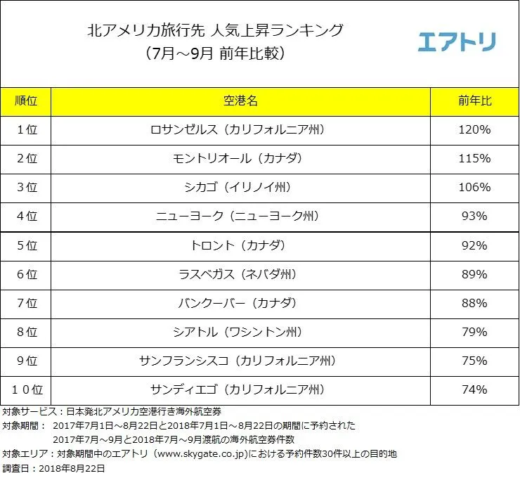 オンライン総合旅行サービス「エアトリ」(https://www.skygate.co.jp)を運営する株式会社エアトリ(本社:東京都新宿区、代表取締役社長:吉村 英毅、以下エアトリ)は、北アメリカ旅行先人気上昇ランキングを発表します。