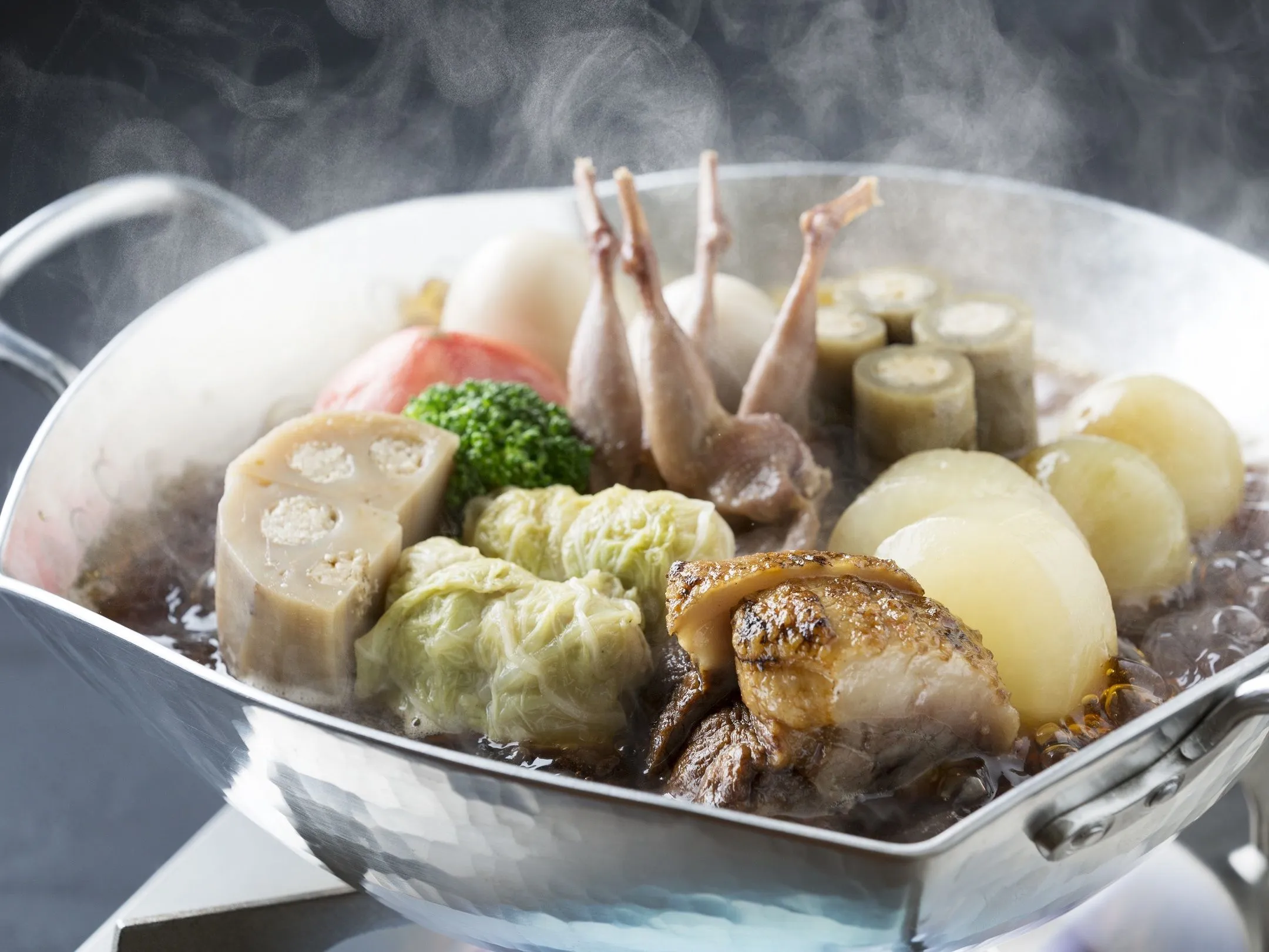 ジビエはイノシシやキジ、ウサギなどを用意します。牛や豚などの家畜肉とは異なり、野性味の強い、肉本来の香りや旨みが感じられます。鹿出汁は、コンソメの味わいを深めたような、濃厚な旨みが特徴。透明感のある琥珀色の出汁が、大根やゴボウなどの根菜類に染み渡ります。