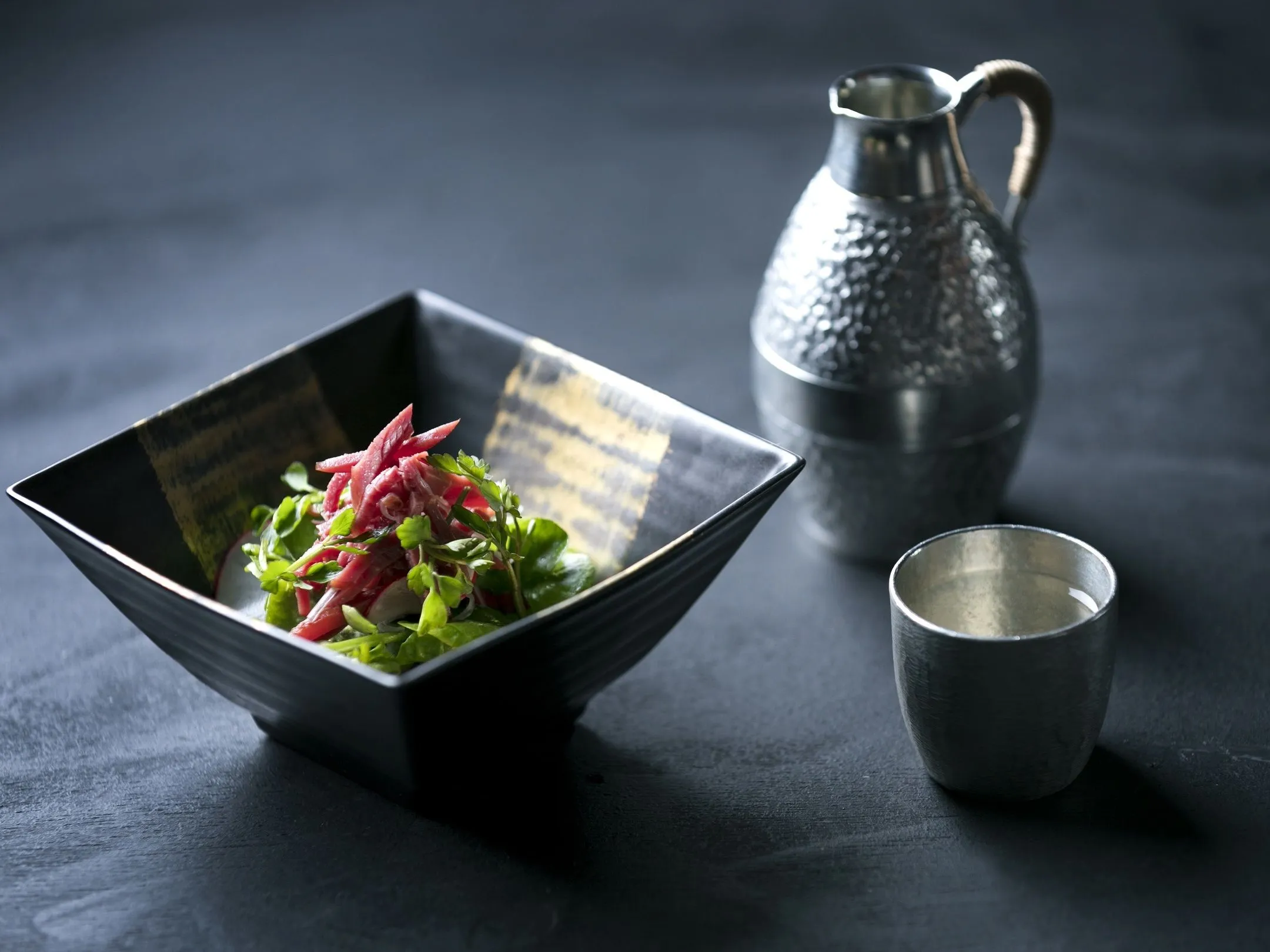 先付けは「鹿の燻製肉と葉野菜・根菜の和え物」です。鹿の燻製肉は柔らかく、噛めば噛むほど口内に旨みが広がり、葉野菜・根菜のシャキシャキ感は食欲を掻き立てます。ぬる燗の日本酒と相性の良い一品です。