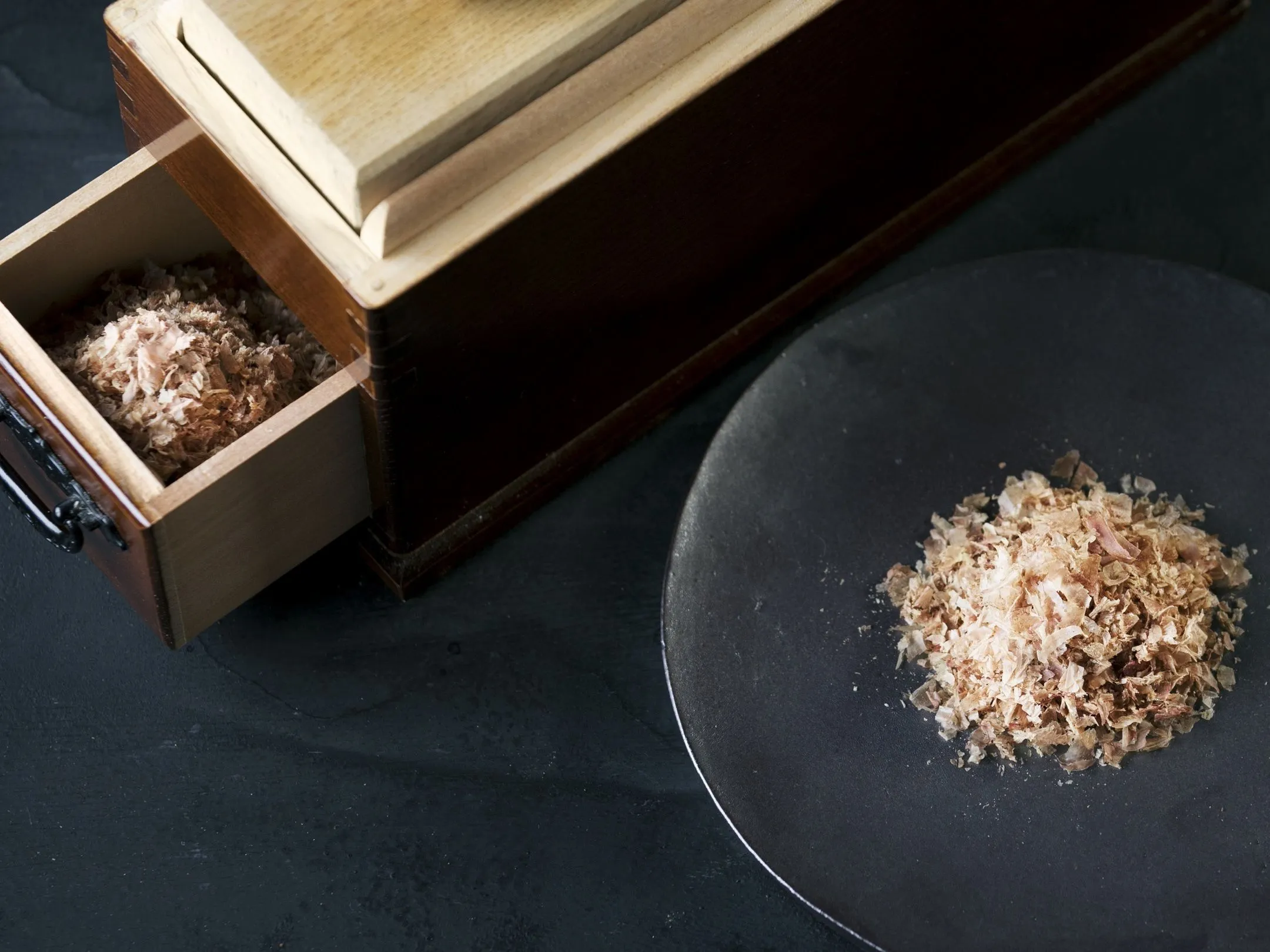 ジビエおでんは、出汁までジビエです。鹿出汁はベースの鶏がらスープに、約20キログラムの鹿モモ肉のミンチと野菜、赤味噌などを練りこみ、約2日かけて作ります。鹿出汁の仕上げには、鹿節を加えます。鹿節が鹿出汁全体の風味をまとめ、香りを立たせる役割を果たします。