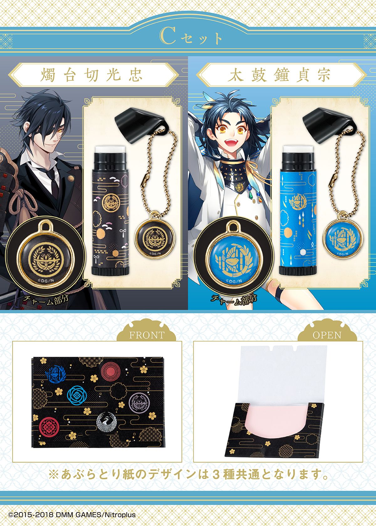 本商品は、PCブラウザ・スマホアプリゲーム「刀剣乱舞-ONLINE-」に登場する、“刀剣男士”6振り(Aセット:加州清光/大和守安定、Bセット:鶴丸国永/大倶利伽羅、Cセット:燭台切光忠/太鼓鐘貞宗)をイメージした「リップクリーム2種」と「あぶらとり紙」のセットです。