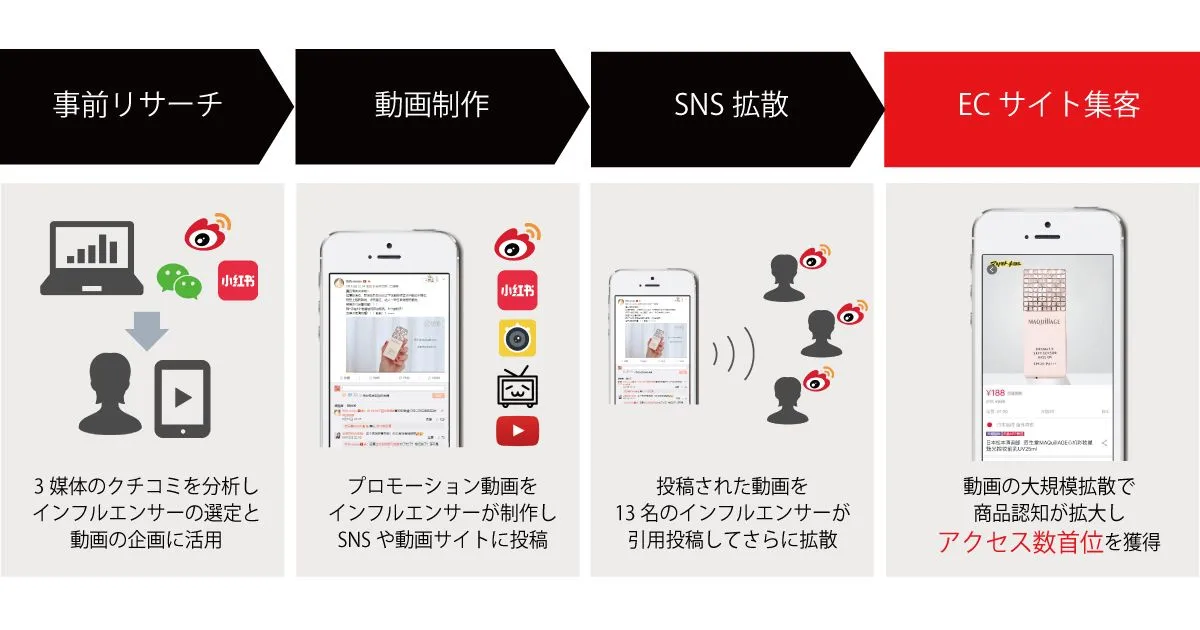 最後に、インフルエンサー本人によるSNS投稿を起点に、中国向けコンテンツ拡散サービス「WEIQ」を利用して「美容」「日本」などの分野に強い13名のインフルエンサーにWeiboでの引用投稿を依頼。累計フォロワー5,300万人に向けて一斉に動画の拡散を行いました。