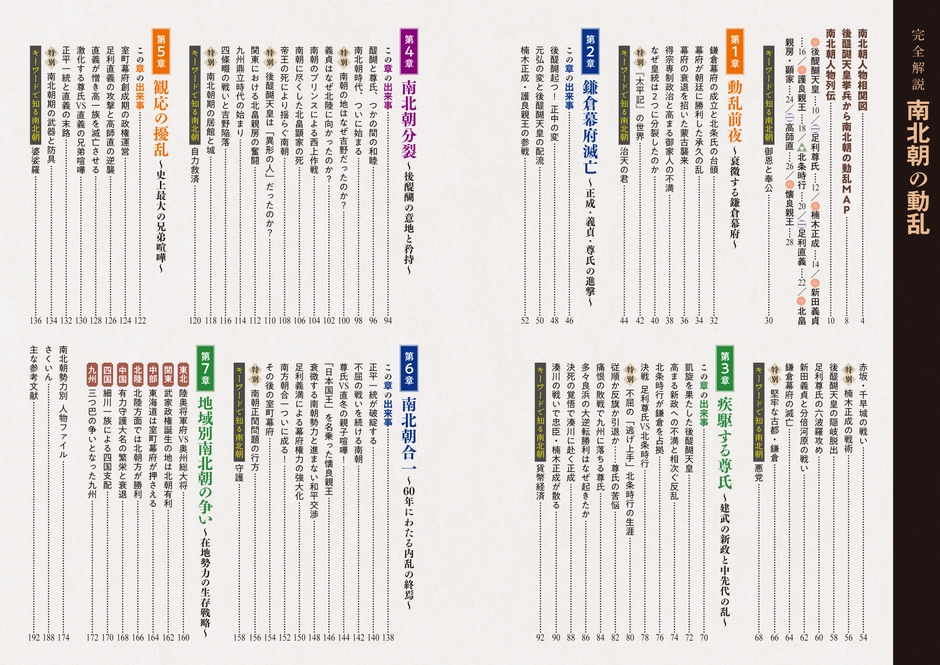 60年にわたる最も複雑で難解な全国的内乱・南北朝時代をオールカラーでわかりやすく完全解説。鎌倉幕府滅亡から南北朝合一に至るまで、人物相関図、動乱・合戦MAP、人物列伝、キーワード・コラム、人物ファイルなどのビジュアルを用い、朝廷が北と南の2つに分かれた「泥沼の権力闘争」を紐解く――。