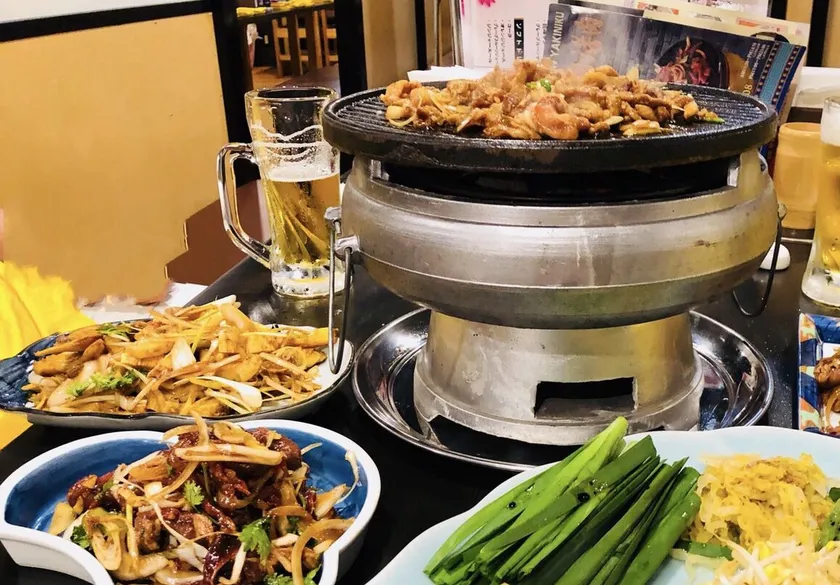 メニューは焼肉は羊肩ロース、羊マメ、羊もも、羊レバー、牛肩ロース、牛タン、牛ハツモト、豚バラ、豚胃袋、エビ、イカ、野菜など24種類あり、焼肉以外でも単品料理で羊の蹄醤油煮、羊頬等20種類以上あります。そして北京バーガー、ジャージャー麺、肉まんなど様々な北京風味を用意しております。