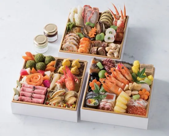 和洋中のシェフが腕を揮う三段のおせち料理。縁起ものの黒豆や海老をはじめとする艶やかな日本料理やフォアグラ、オマール海老で織りなすフランス料理、多彩な食材を風味豊かに仕上げた中国料理をお楽しみいただけます。おもてなしの心をひと品ひと品に。受け継がれてきた技と感性で、新春を華やかに彩ります。
