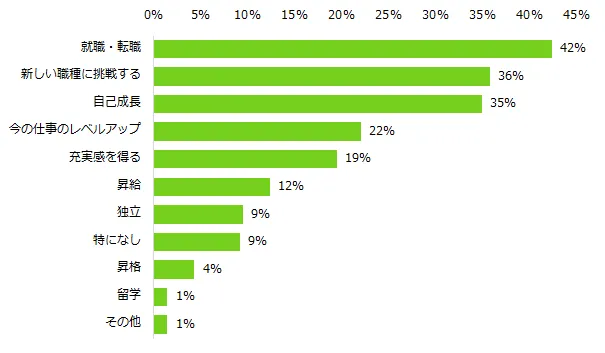 希望するスキルを身につけて、実現したいことを尋ねると、多かった回答トップ3は「就職・転職」(42%)、「新しい職種に挑戦する」(36%)、「自己成長」(35%)でした。