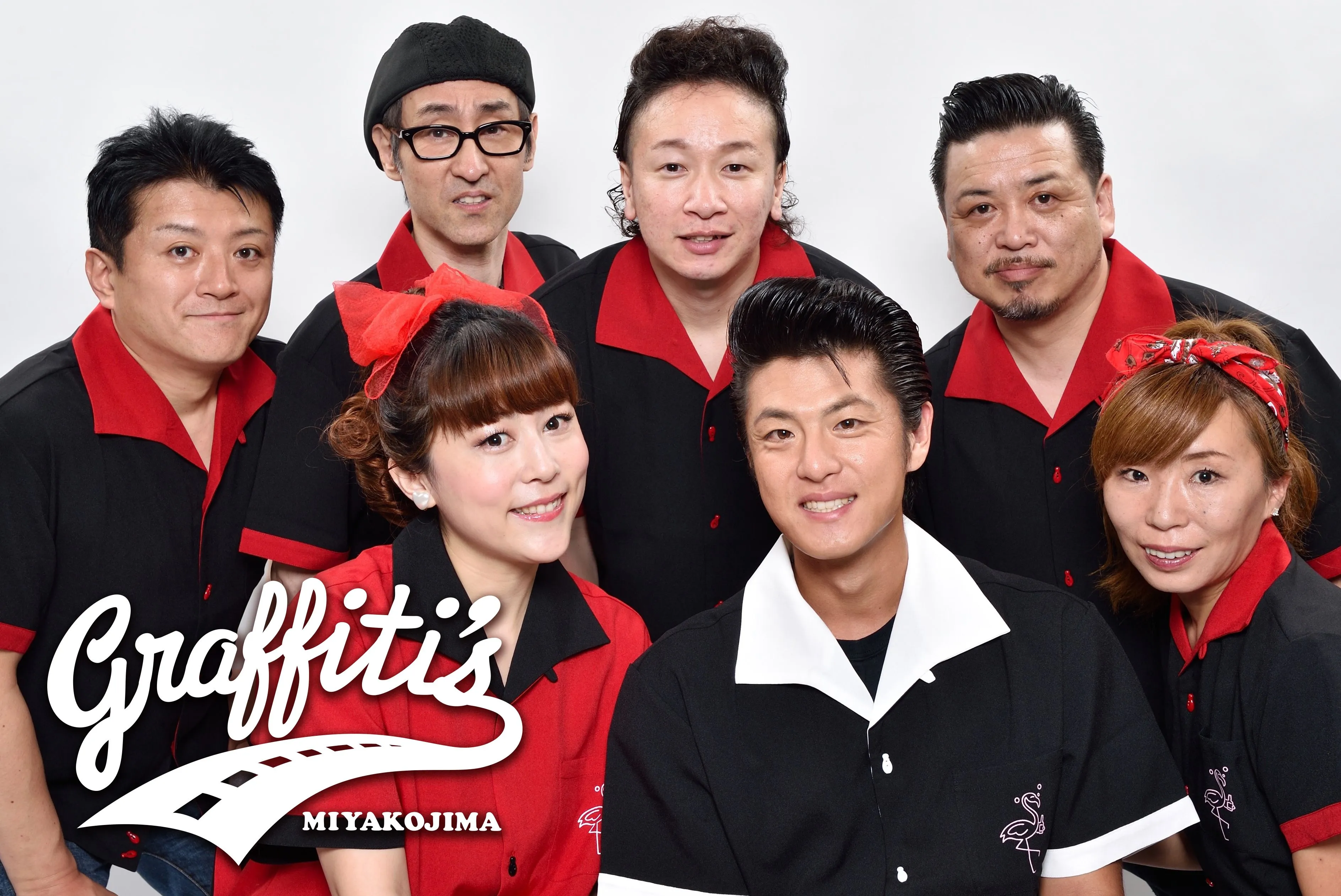 『ファンキーフラミンゴ』は50年代や60年代の“あの古き良きアメリカ“へとタイムスリップさせてくれるアメリカンスタイルのオールディーズライブ&ダイニングバーです。ネオン輝く店内にはいつの時もリスペクトされている世界や日本のアーティスト写真が勢揃い。クールでノスタルジックなサウンドホールで毎夜熱い演奏を繰り広げてくれるのはCONNY’S COMPANYがプロデュースする「MIYAKOJIMAグラフィティーズ」。「MIYAKOJIMAグラフィティーズ」は『ファンキーフラミンゴ』でしか出会うことが出来ないアメリカンスピリットを体現するバンドです。50年代や60年代のオールディーズをメインに、迫力ある生演奏でお届けします。今も愛され続ける名曲の数々からスタンダードナンバーまで、「MIYAKOJIMAグラフィティーズ」は南国のナイトライフをエネルギッシュに彩ります。