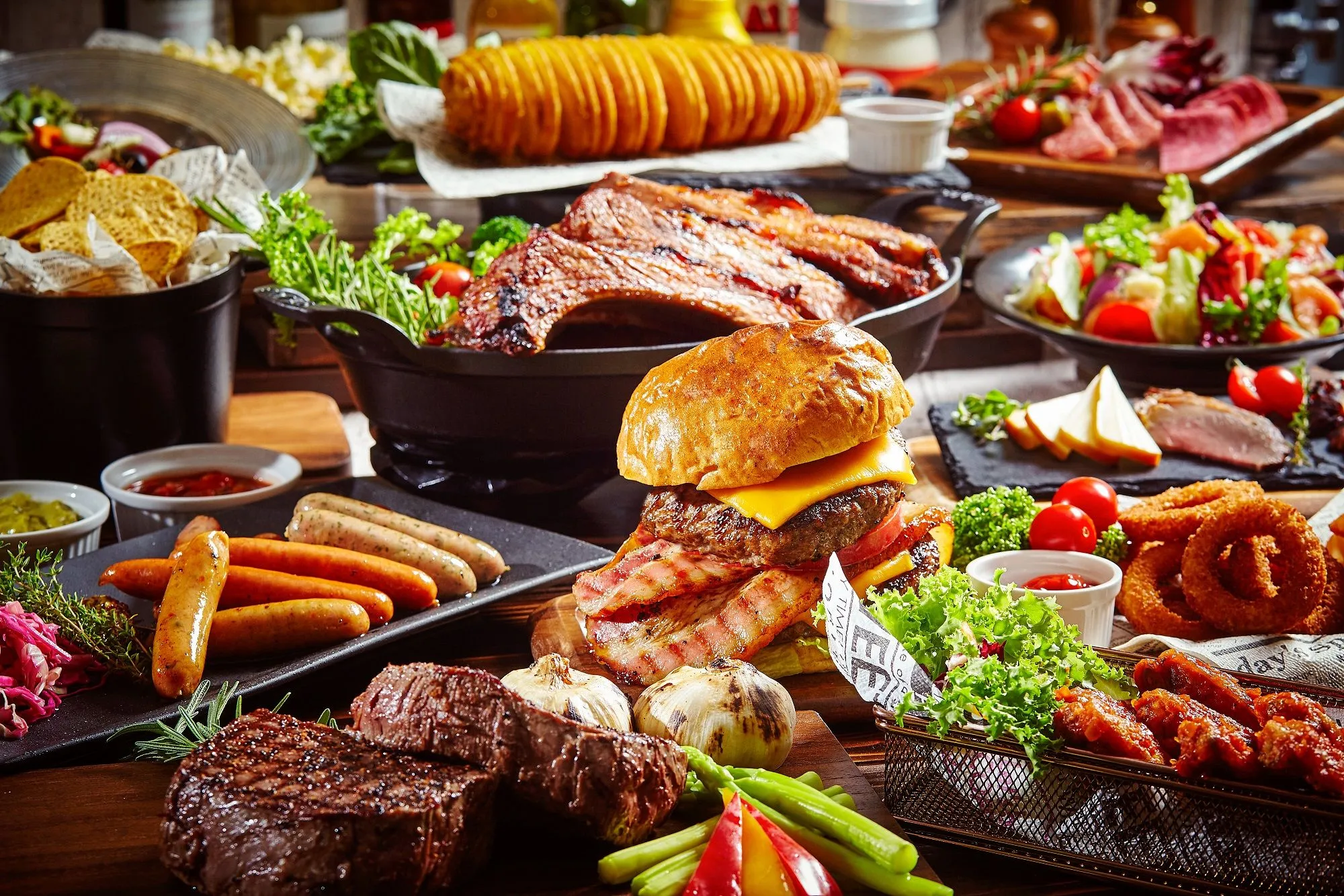アメリカンなムードで満たされている店内では、エキサイティングな生演奏と共にアメリカンダイナーのメニューをお召し上がり頂けます。肉厚でダイナミックなハンバーガー、ボリューム満点のスペアリブやステーキ、アルコールが進むサイドディッシュなど多種ご用意いたしました。カウンターバーを併設しておりますので、オリジナルカクテルを始めとするドリンクも豊富に取り揃えております。