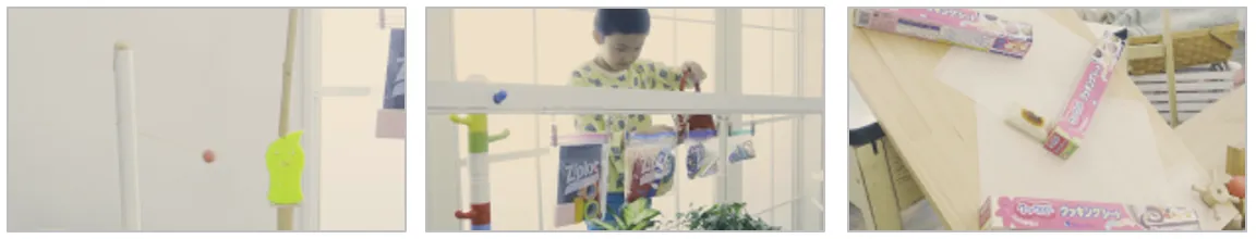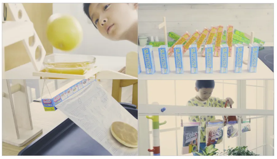 続いて、男の子が、そのコンテナーを小さなシーソーの上に置くと、糸でつるされたボールがぐるぐると回り、「ズビズバ(R)」に直撃。すると、仕掛けが動き出し、小物の入った色々な種類の「ジップロック(R)」のバッグたちが移動します。男の子がジョウロで水をかけると、ジップロック(R)バッグにも水がかかりますが、安心の密封性があるので中が濡れることなく通り抜けていきます。その先には、「クックパークッキングシート(R)」が仕掛けられており、その上を、焼いたお餅がくっつかず、するりと滑っていきます。